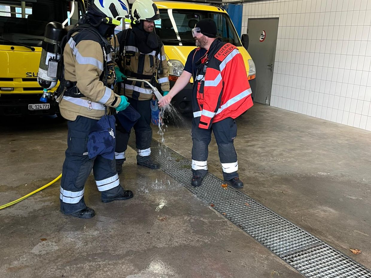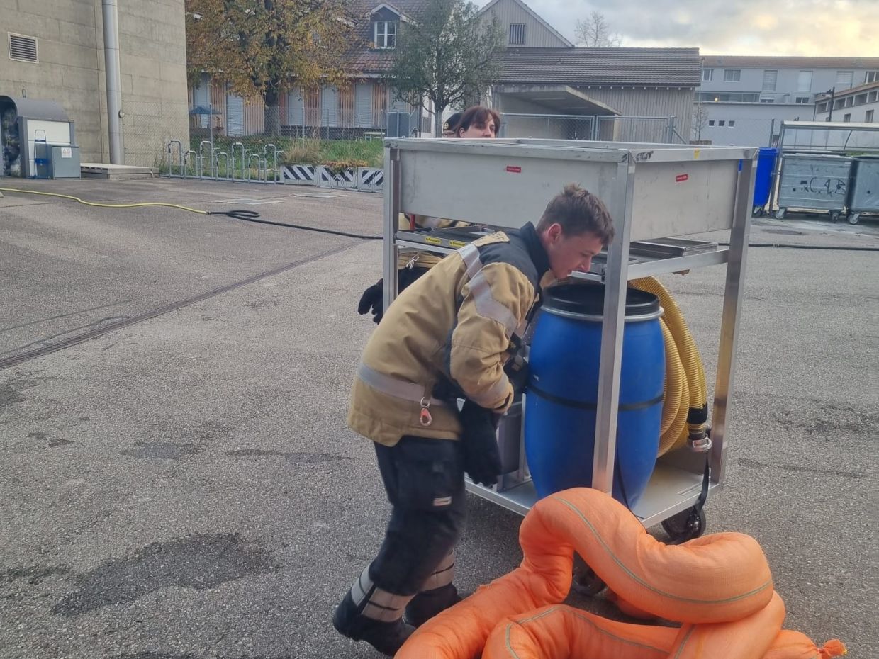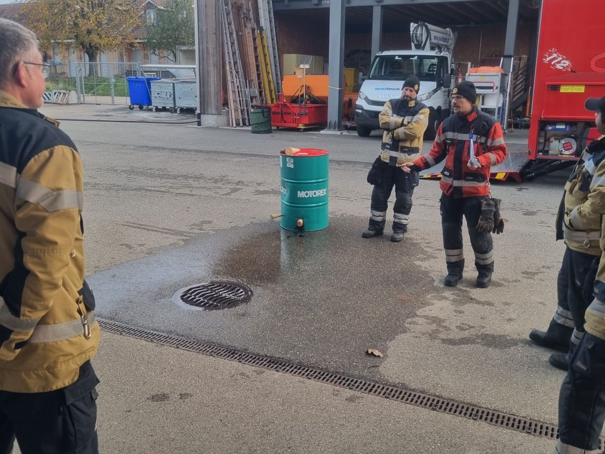 Dekontamination, Auffangen, Retablieren - das waren die Stichworte zur vierten und letzten Mannschaftsübung in diesem Jahr. Wir gehen ein bisschen detaillierter darauf ein: Einen Patienten im Notfall schnell zu dekontaminieren ohne den Schaden für die Umgebung und den Patienten zu vergrössern war Thema in der ersten Lektion. In Lektion 2 wurde das Auffangen von verschiedenen Medien, also zum Beispiel Öl oder andere Substanzen, drangenommen. Und zuletzt wurde das Reinigungs-Konzept nach Grosseinsätzen besprochen, unter anderem die Schwarz/Weiss-Regeln. Zum Abschluss gab es eine Einsatzübung.